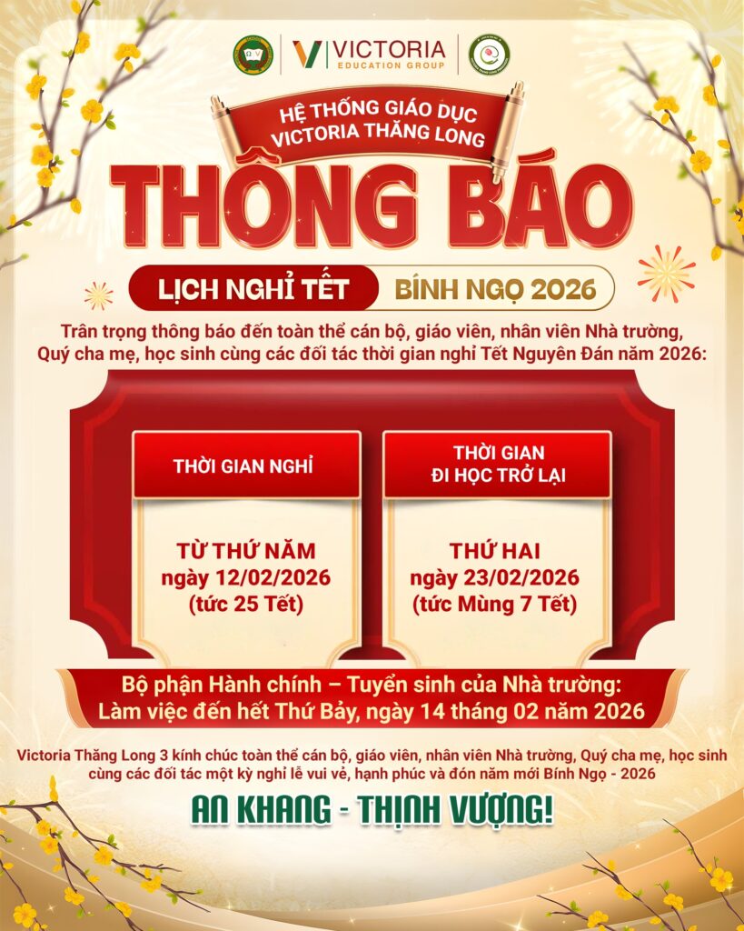 Trường TH&THCS Victoria Thăng Long 3 trân trọng thông báo tới toàn thể cán bộ, giáo viên, nhân viên, quý phụ huynh, đối tác và các em học sinh lịch nghỉ Tết Nguyên đán Bính Ngọ 2026 như sau: Thời gian nghỉ Tết Nguyên đán của học sinh: Từ Thứ Năm, ngày 12 tháng 02 […]