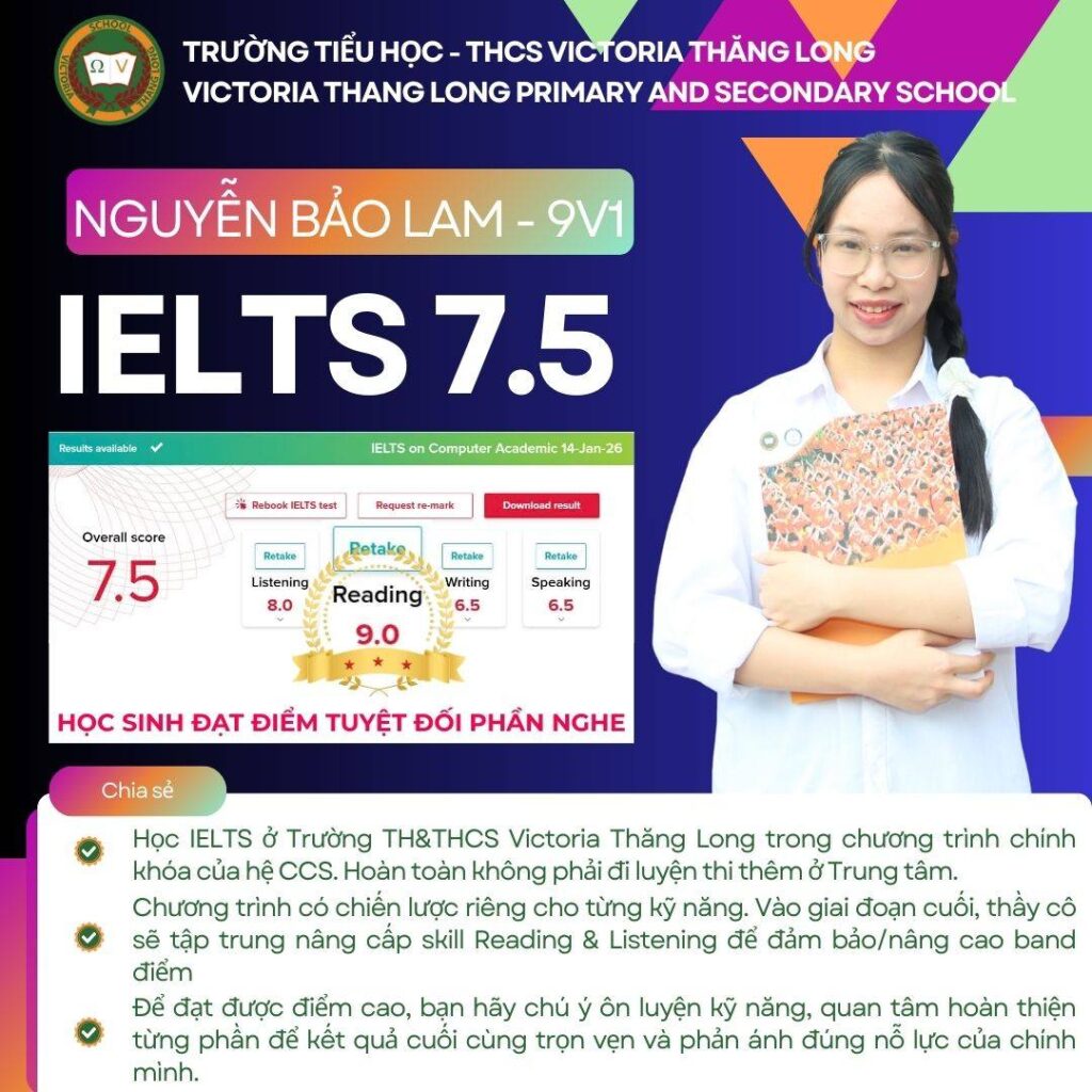 Vicser Nguyễn Bảo Lam, học sinh lớp 9V1 CCS, chính thức ghi danh vào bảng vàng với IELTS 7.5 – một cột mốc học thuật quan trọng, đánh dấu hành trình học tập bền bỉ, nghiêm túc và đầy quyết tâm của Bảo Lam. Thành tích này không chỉ là kết quả đáng ghi nhận, […]