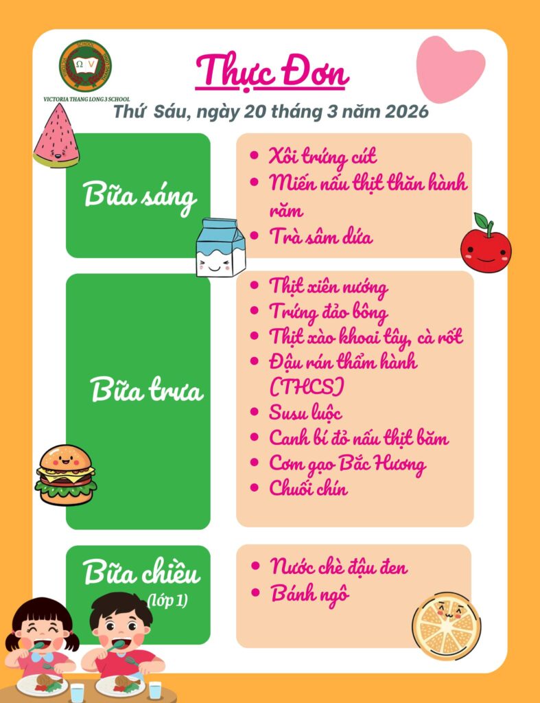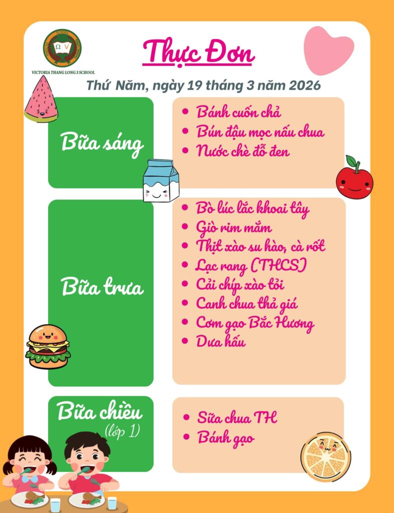 Bữa sáng • Bánh giầy kẹp giò • Phở gà • Trà xanh Bữa sáng cung cấp năng lượng đầy đủ với tinh bột và đạm, giúp học sinh khởi đầu ngày mới tràn đầy hứng khởi. Bữa trưa • Thịt kho trứng • Đậu rán tẩm hành • Ức gà xào ngô • Lạc […]