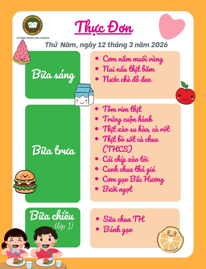 Tại Trường TH&THCS Victoria Thăng Long 3, mỗi bữa ăn được xây dựng khoa học, đảm bảo cân bằng dinh dưỡng, giúp học sinh luôn khỏe mạnh, tập trung và phát triển toàn diện. Thứ Năm, ngày 12/03/2026, thực đơn trong ngày gồm: Bữa sáng đa dạng – đủ chất – tràn đầy năng lượng […]