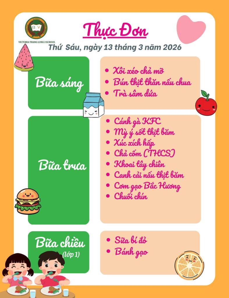 Thực đơn Thứ Sáu, ngày 13/03/2026