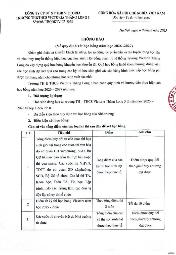 THÔNG BÁO VỀ QUY ĐỊNH XÉT HỌC BỔNG NĂM HỌC 2026 – 2027