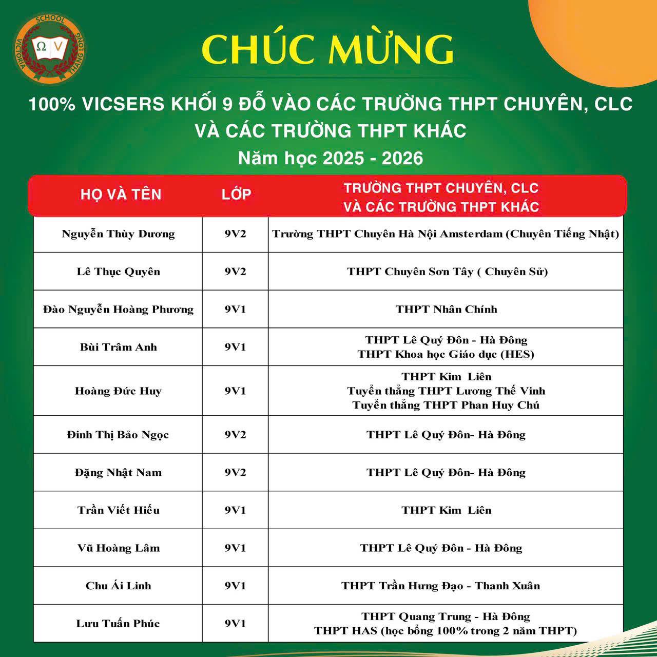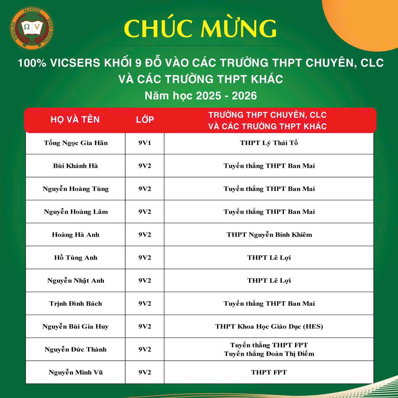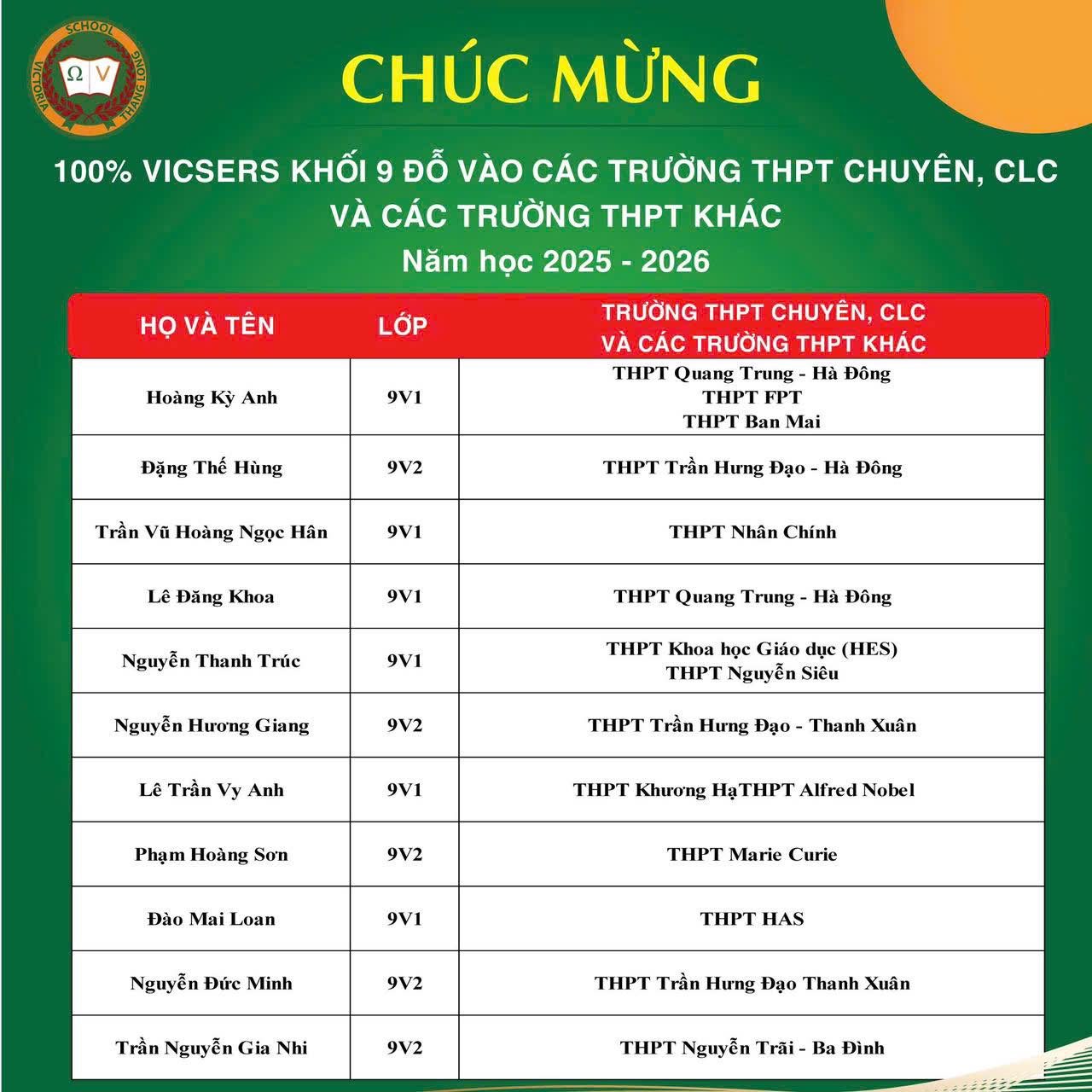 Cánh cửa THPT mở ra một hành trình mới. Các con hãy mang theo những giá trị, kĩ năng và tinh thần mà Victoria Thăng Long đã vun đắp để tiếp tục viết tiếp những giấc mơ, chinh phục những mục tiêu lớn lao hơn. Một lần nữa, xin gửi lời chúc mừng đến các bậc phụ huynh, các thầy cô giáo và đặc biệt là các Vicsers 9K5 thân yêu với kết quả xuất sắc trong kì thi vào lớp 10 năm học 2025 – 2026. Yêu thương và tự hào về 9K5!