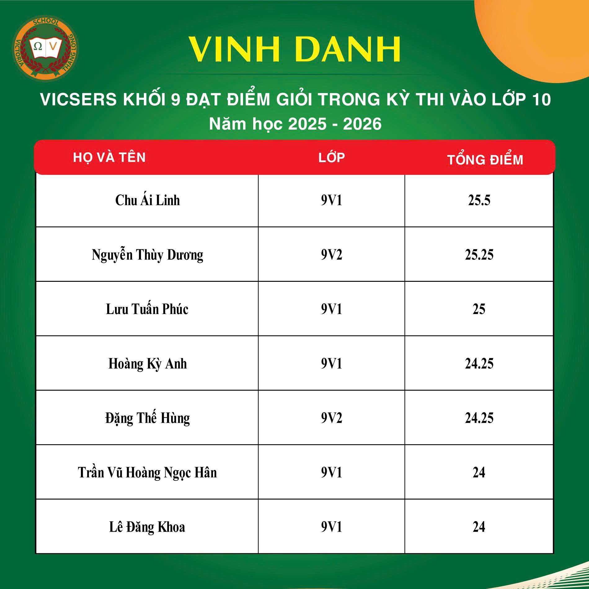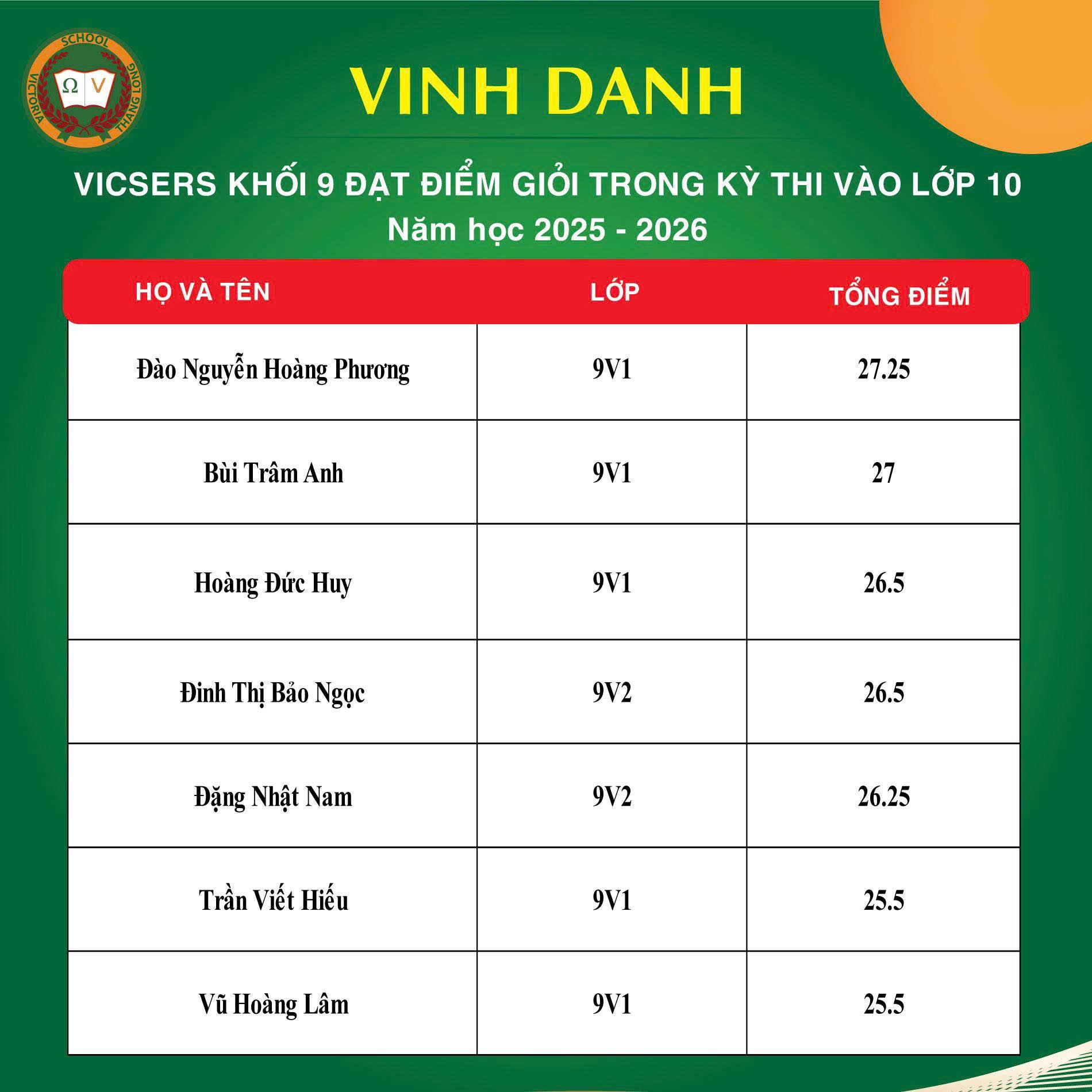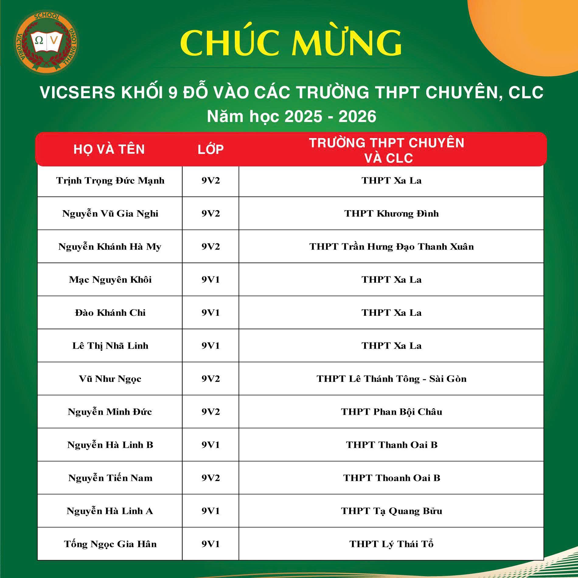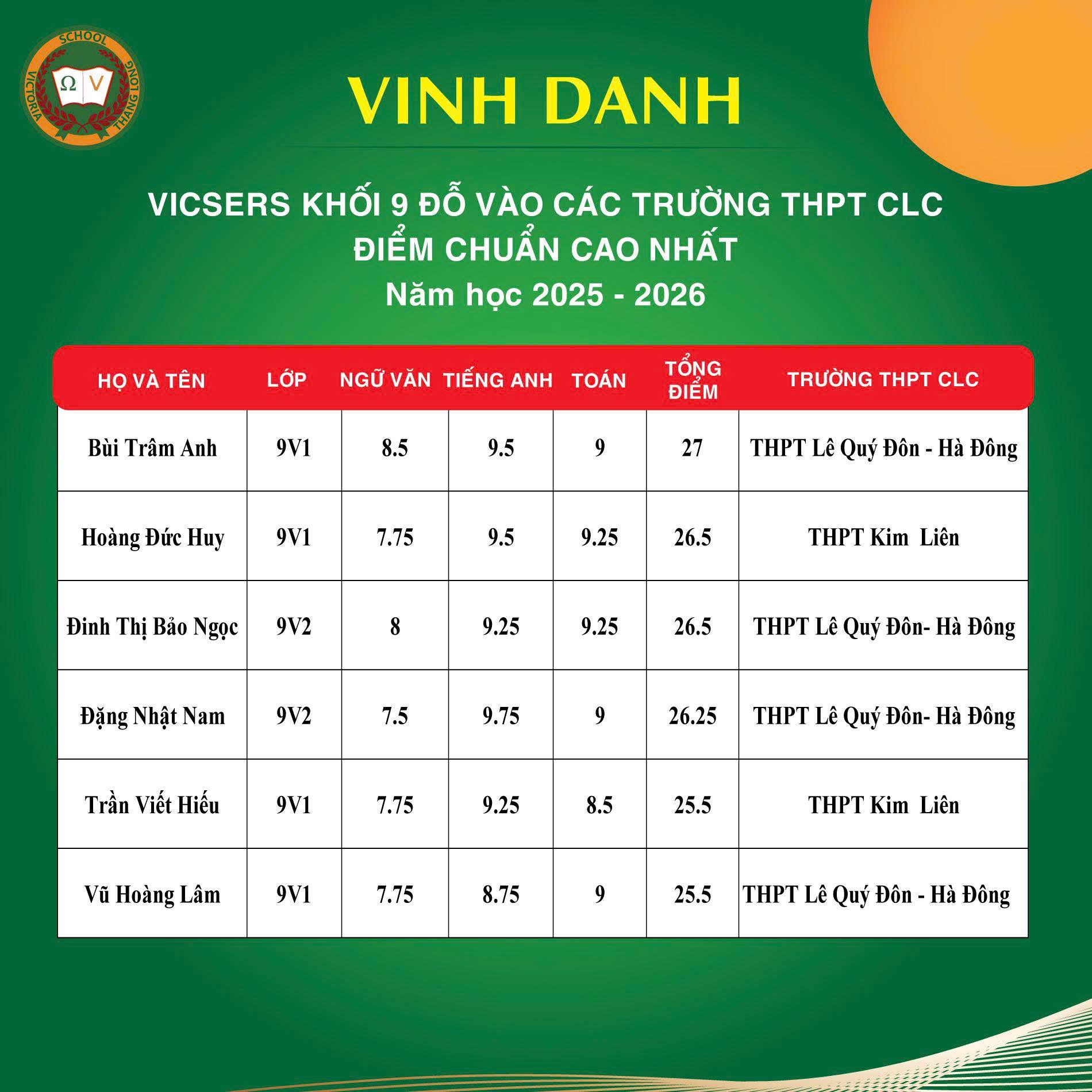 Cánh cửa THPT mở ra một hành trình mới. Các con hãy mang theo những giá trị, kĩ năng và tinh thần mà Victoria Thăng Long đã vun đắp để tiếp tục viết tiếp những giấc mơ, chinh phục những mục tiêu lớn lao hơn. Một lần nữa, xin gửi lời chúc mừng đến các bậc phụ huynh, các thầy cô giáo và đặc biệt là các Vicsers 9K5 thân yêu với kết quả xuất sắc trong kì thi vào lớp 10 năm học 2025 – 2026. Yêu thương và tự hào về 9K5!