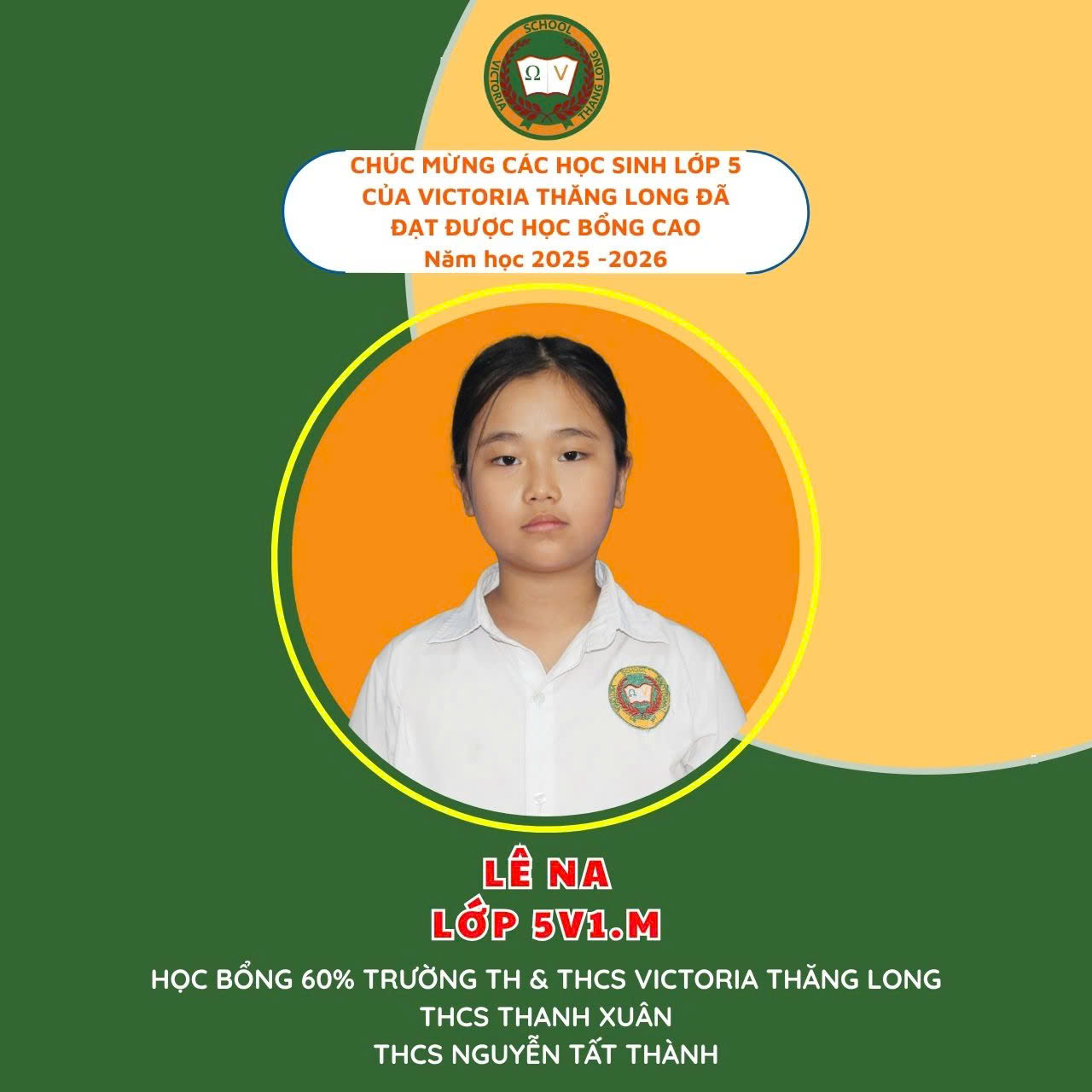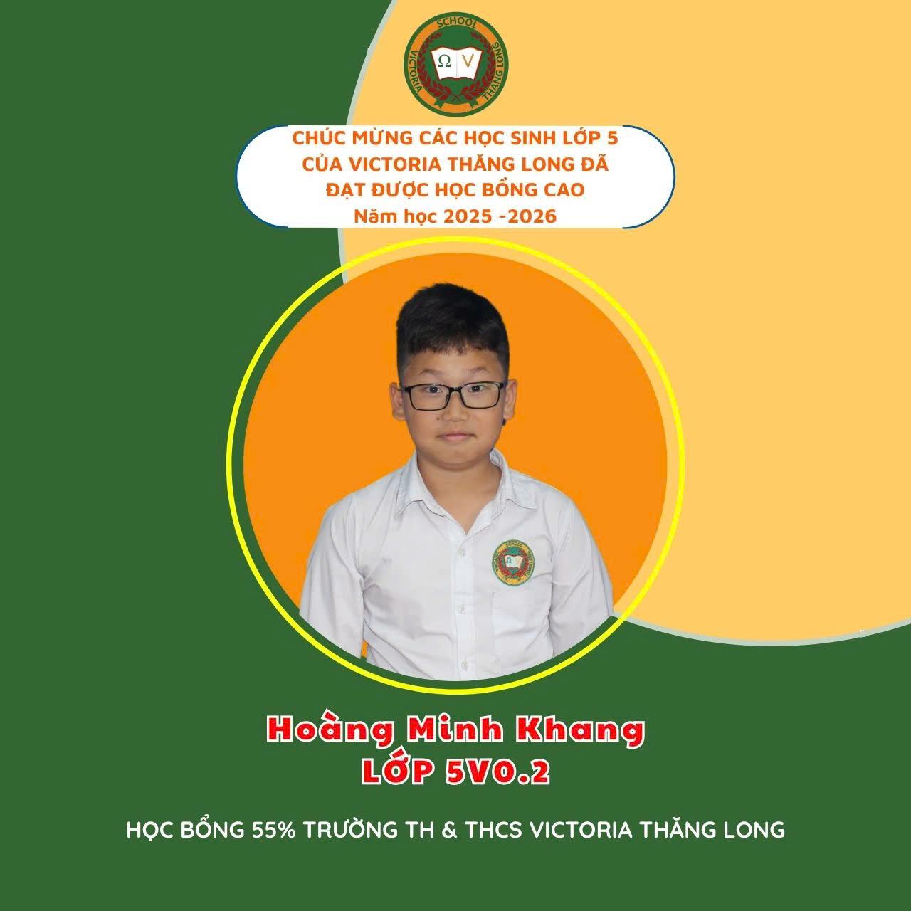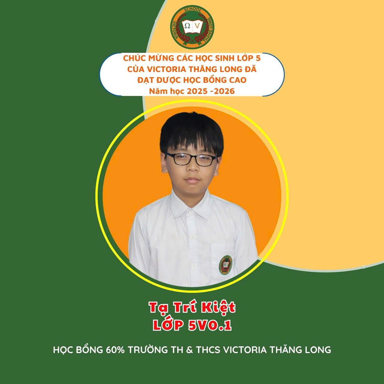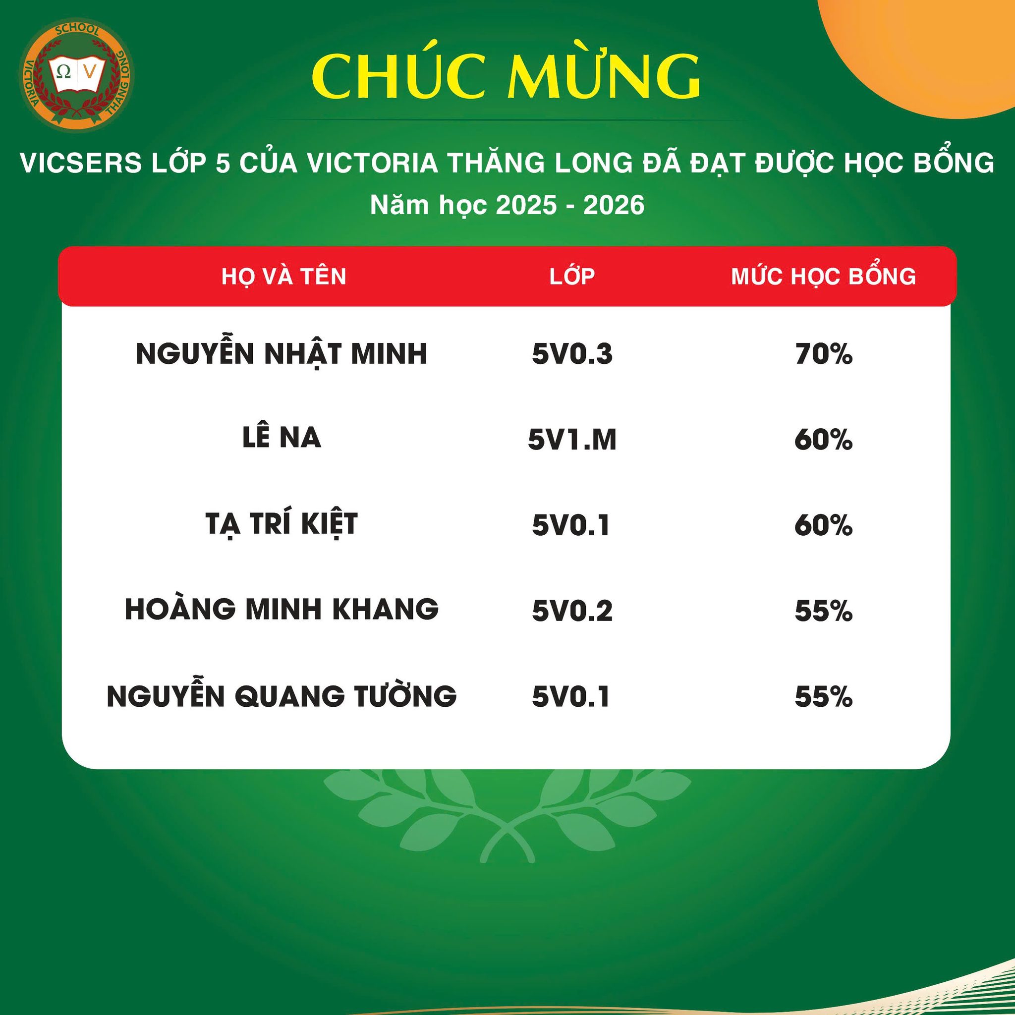 Tại kỳ thi học bổng Victars, nhiều học sinh lớp 5 đã ghi dấu ấn với những kết quả cao, vững vàng chinh phục các suất học bổng danh giá của Nhà trường. Thành tích ấy không chỉ minh chứng cho năng lực học thuật toàn diện mà còn thể hiện sự tự tin, bản lĩnh và niềm đam mê học tập mạnh mẽ của các bạn nhỏ ngay từ bậc Tiểu học. Đặc biệt, nhiều Vicser đã lựa chọn tiếp tục theo học lên bậc THCS tại Victoria Thăng Long, tiếp nối hành trình tri thức trong môi trường giáo dục hiện đại, đầy yêu thương và truyền cảm hứng.