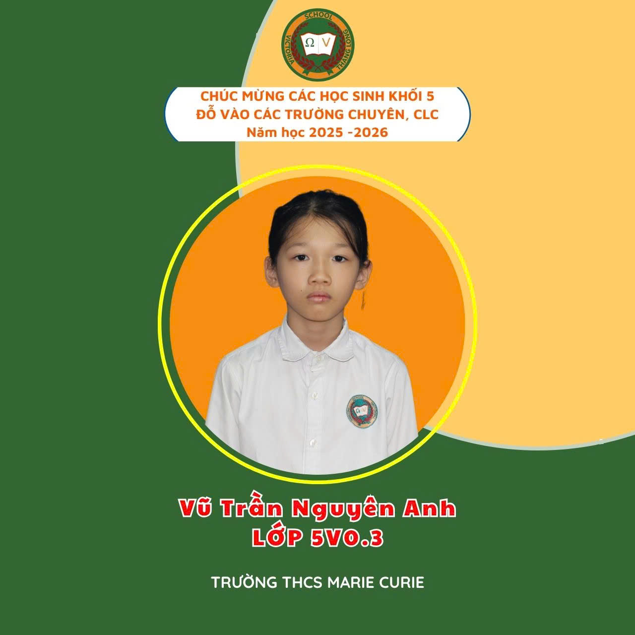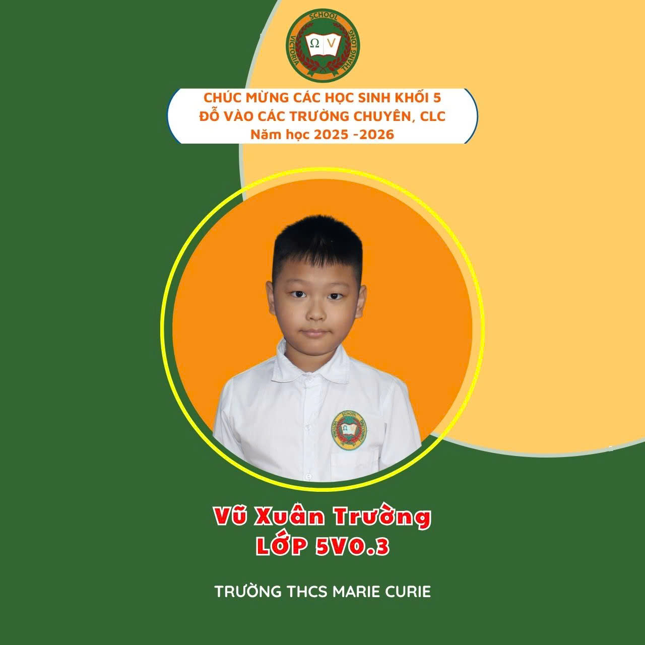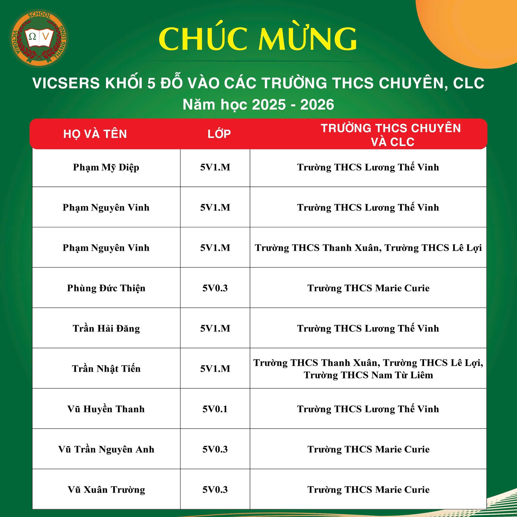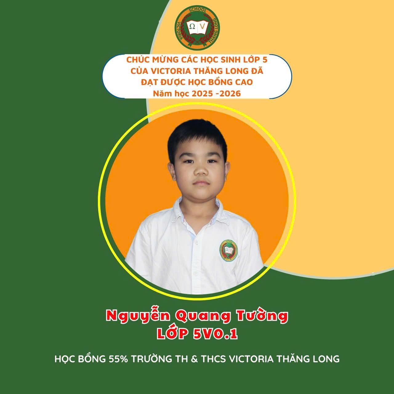Tại kỳ thi học bổng Victars, nhiều học sinh lớp 5 đã ghi dấu ấn với những kết quả cao, vững vàng chinh phục các suất học bổng danh giá của Nhà trường. Thành tích ấy không chỉ minh chứng cho năng lực học thuật toàn diện mà còn thể hiện sự tự tin, bản lĩnh và niềm đam mê học tập mạnh mẽ của các bạn nhỏ ngay từ bậc Tiểu học. Đặc biệt, nhiều Vicser đã lựa chọn tiếp tục theo học lên bậc THCS tại Victoria Thăng Long, tiếp nối hành trình tri thức trong môi trường giáo dục hiện đại, đầy yêu thương và truyền cảm hứng.