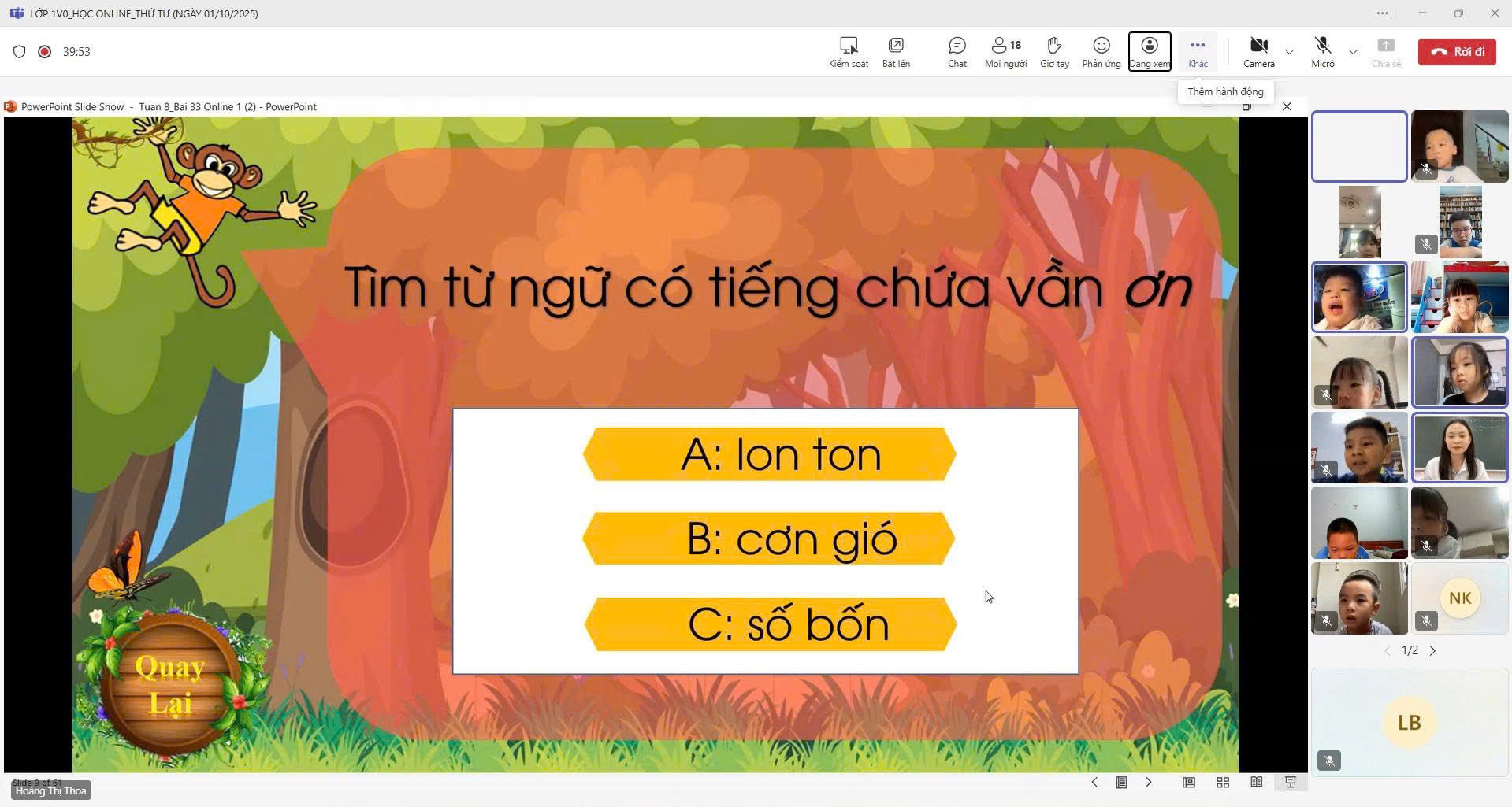 Lớp 4V1: Biểu dương tinh thần chủ động và kỉ luật của lớp. Các con duy trì nền nếp học online rất chuẩn: bật cam nghiêm túc, chú ý lắng nghe, hăng hái phát biểu, bật/tắt mic đúng lúc. Đây chính là minh chứng rõ ràng cho sự trưởng thành và tự giác của các bạn nhỏ Tiểu học.